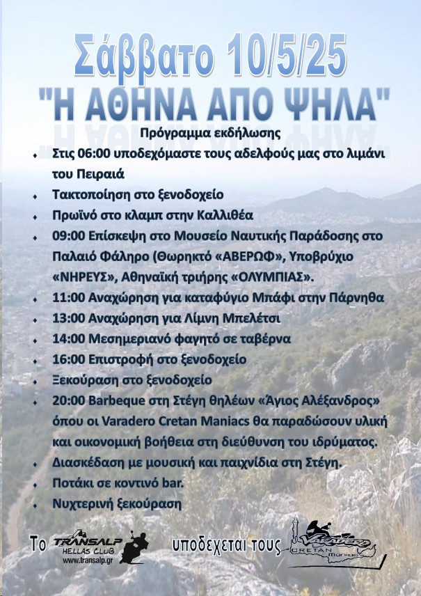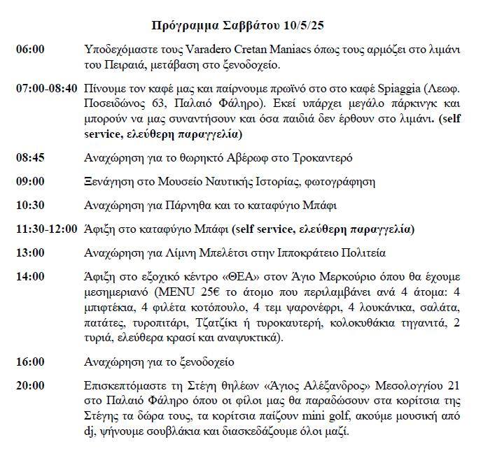 Ετοιμαστείτε για μία ολοήμερη εκδήλωση για το Σάββατο 10/5/25 από τις 06:00, με συναντήσεις, εκδρομές, φιλανθρωπικές εκδηλώσεις και φυσικά φαγητό και διασκέδαση.
